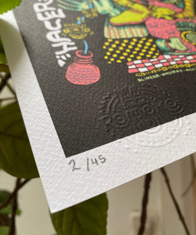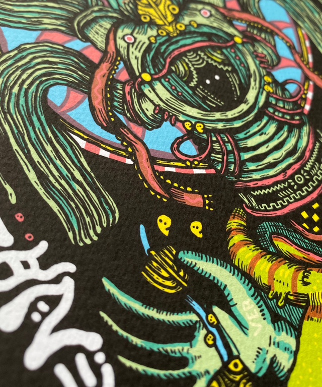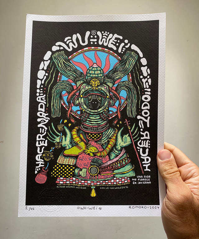 Based on the taoist concept of "not doing anything/doing everything" this delicious screenprint was printed in 5 colours (with the last one being a nightglow flourescent layer!).